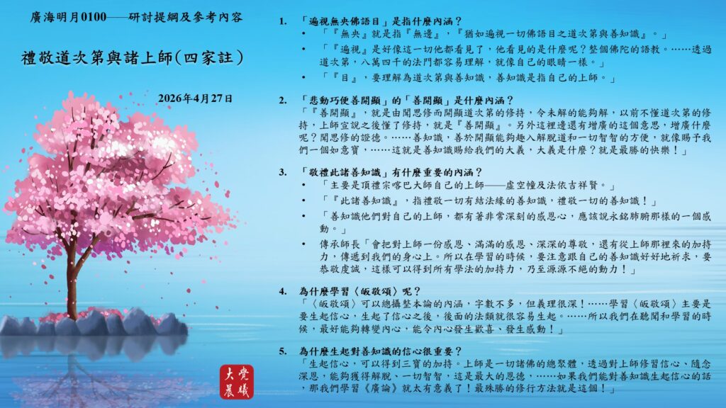 「生起信心,可以得到三寶的加持。上師是一切諸佛的總聚體,透過對上師修習信心、隨念深恩,能夠獲得解脫、一切智智,這是最大的恩德,⋯⋯如果我們能對善知識生起信心的話,那我們學習《廣論》就太有意義了!最殊勝的修行方法就是這個!」