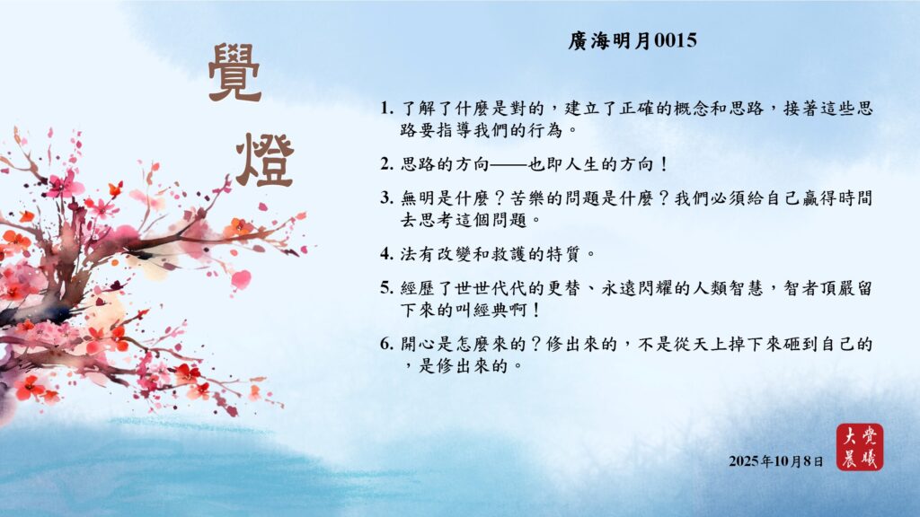廣海明月0015 覺燈 (2025/10/08) Post author:大覺晨曦編輯組 Post published:2025/10/09 Post category:覺燈 1. 了解了什麼是對的,建立了正確的概念和思路,接著這些思路要指導我們的行為。2. 思路的方向——也即人生的方向!3. 無明是什麼?苦樂的問題是什麼?我們必須給自己贏得時間去思考這個問題。4. 法有改變和救護的特質。5. 經歷了世世代代的更替、永遠閃耀的人類智慧,智者頂嚴留下來的叫經典啊!6. 開心是怎麼來的?修出來的,不是從天上掉下來砸到自己的,是修出來的。 累計閱覽數: 382 Read more articles Previous Post廣海明月0014 覺燈 (2025/10/07) Next Post廣海明月0524 覺燈1 (2025/10/09)