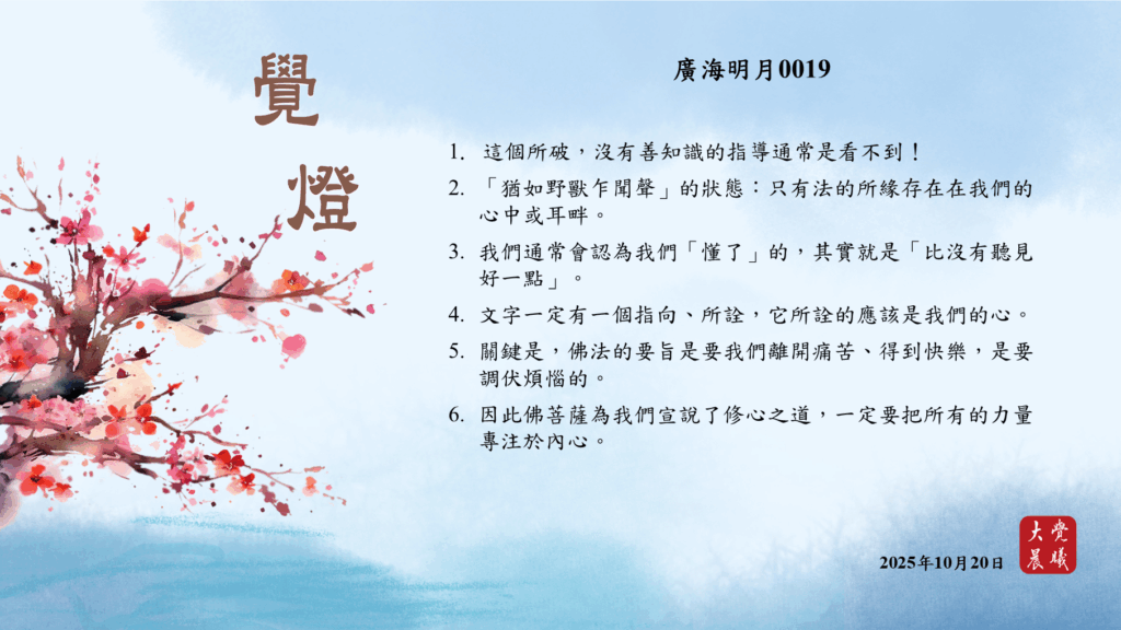廣海明月0019 覺燈 (2025/10/20) Post author:大覺晨曦編輯組 Post published:2025/10/22 Post category:覺燈 1. 這個所破,沒有善知識的指導通常是看不到!2. 「猶如野獸乍聞聲」的狀態:只有法的所緣存在在我們的心中或耳畔。3. 我們通常會認為我們「懂了」的,其實就是「比沒有聽見好一點」。4. 文字一定有一個指向、所詮,它所詮的應該是我們的心。5. 關鍵是,佛法的要旨是要我們離開痛苦、得到快樂,是要調伏煩惱的。6. 因此佛菩薩為我們宣說了修心之道,一定要把所有的力量專注於內心。 累計閱覽數: 352 Read more articles Previous Post〈辯論營開示──懷著希望的理路而活,向憂鬱宣戰〉07 覺燈 (2025/10/19) Next Post廣海明月0020 覺燈 (2025/10/21)