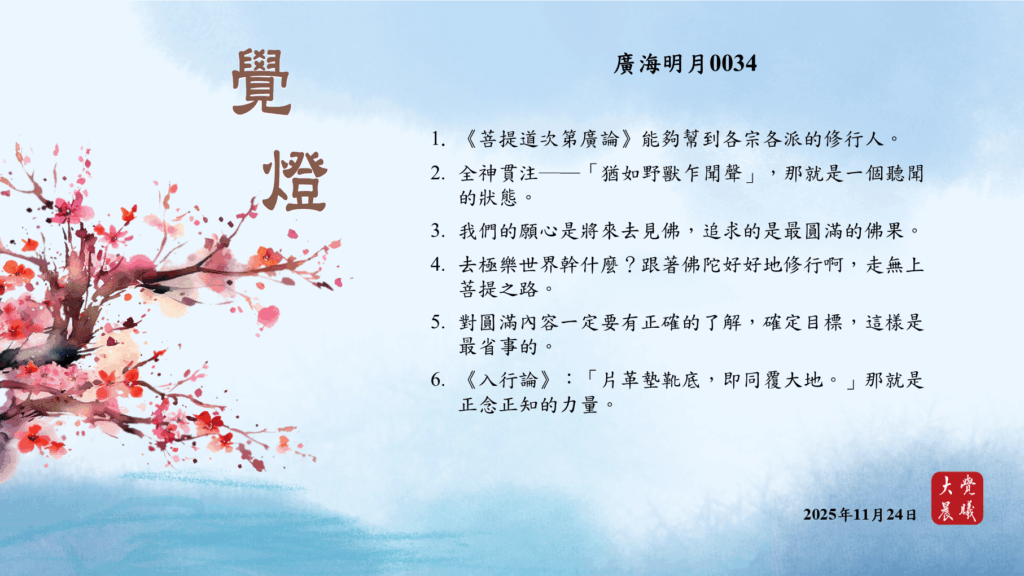 廣海明月0034 覺燈 (2025/11/24) Post author:大覺晨曦編輯組 Post published:2025/11/25 Post category:覺燈 1. 《菩提道次第廣論》能夠幫到各宗各派的修行人。2. 全神貫注——「猶如野獸乍聞聲」,那就是一個聽聞的狀態。3. 我們的願心是將來去見佛,追求的是最圓滿的佛果。4. 去極樂世界幹什麼?跟著佛陀好好地修行啊,走無上菩提之路。5. 對圓滿內容一定要有正確的了解,確定目標,這樣是最省事的。6. 《入行論》:「片革墊靴底,即同覆大地。」那就是正念正知的力量。 累計閱覽數: 237 Read more articles Previous Post〈賢愚經業果故事──迦旃延教老母賣貧品、貧人夫婦疊施得現報品〉02 覺燈 (2025/11/23) Next Post廣海明月0035 覺燈 (2025/11/25)