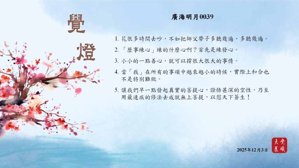廣海明月0039 覺燈 (2025/12/03) Post author:大覺晨曦編輯組 Post published:2025/12/04 Post category:覺燈 1. 花很多時間去吵,不如把師父帶子多聽幾遍、多聽幾遍。2. 「歷事練心」練的什麼心啊?首先是練發心。3. 小小的一點善心,就可以撐很大很大的事情。4. 當「我」在所有的事項中越來越小的時候,實際上和合也不是特別難做。5. 讓我們早一點發起真實的菩提心,證悟甚深的空性,乃至用最速疾的修法去成就無上菩提,以慰天下蒼生! 累計閱覽數: 243 Read more articles Previous Post廣海明月0038 覺燈 (2025/12/02) Next Post廣海明月0531 覺燈1 (2025/12/04)