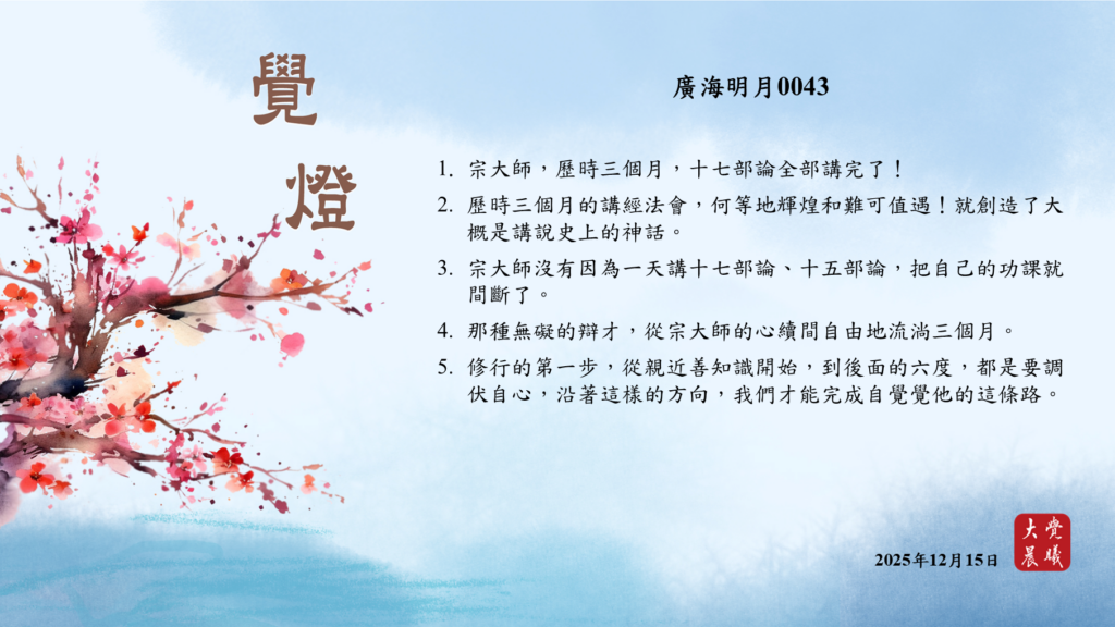 廣海明月0043 覺燈 (2025/12/15) Post author:大覺晨曦編輯組 Post published:2025/12/17 Post category:覺燈 1. 宗大師,歷時三個月,十七部論全部講完了!2. 歷時三個月的講經法會,何等地輝煌和難可值遇!就創造了大概是講說史上的神話。3. 宗大師沒有因為一天講十七部論、十五部論,把自己的功課就間斷了。4. 那種無礙的辯才,從宗大師的心續間自由地流淌三個月。5. 修行的第一步,從親近善知識開始,到後面的六度,都是要調伏自心,沿著這樣的方向,我們才能完成自覺覺他的這條路。 累計閱覽數: 213 Read more articles Previous Post〈賢愚經業果故事──迦旃延教老母賣貧品、貧人夫婦疊施得現報品〉05 覺燈 (2025/12/14) Next Post廣海明月0044 覺燈 (2025/12/16)