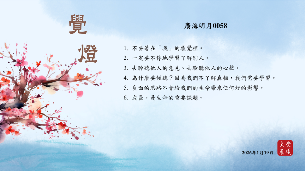 廣海明月0058 覺燈 (2026/01/19) Post author:大覺晨曦編輯組 Post published:2026/01/21 Post category:覺燈 1. 不要著在「我」的感覺裡。2. 一定要不停地學習了解別人。3. 去聆聽他人的意見、去聆聽他人的心聲。4. 為什麼要傾聽?因為我們不了解真相,我們需要學習。5. 負面的思路不會給我們的生命帶來任何好的影響。6. 成長,是生命的重要課題。 累計閱覽數: 160 Read more articles Previous Post〈中秋開示_決斷利他、發菩提心、點亮善行心燈〉03 覺燈 (2026/01/18) Next Post廣海明月0059 覺燈 (2026/01/20)