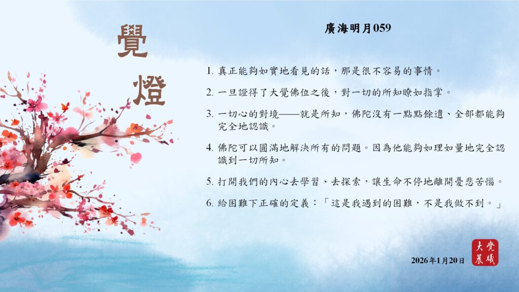 廣海明月0059 覺燈 (2026/01/20) Post author:大覺晨曦編輯組 Post published:2026/01/21 Post category:覺燈 1. 真正能夠如實地看見的話,那是很不容易的事情。2. 一旦證得了大覺佛位之後,對一切的所知瞭如指掌。3. 一切心的對境——就是所知,佛陀沒有一點點餘遺、全部都能夠完全地認識。4. 佛陀可以圓滿地解決所有的問題。因為他能夠如理如量地完全認識到一切所知。5. 打開我們的內心去學習、去探索,讓生命不停地離開憂悲苦惱。6. 給困難下正確的定義:「這是我遇到的困難,不是我做不到。」 累計閱覽數: 155 Read more articles Previous Post廣海明月0058 覺燈 (2026/01/19) Next Post廣海明月0060 覺燈 (2026/01/21)