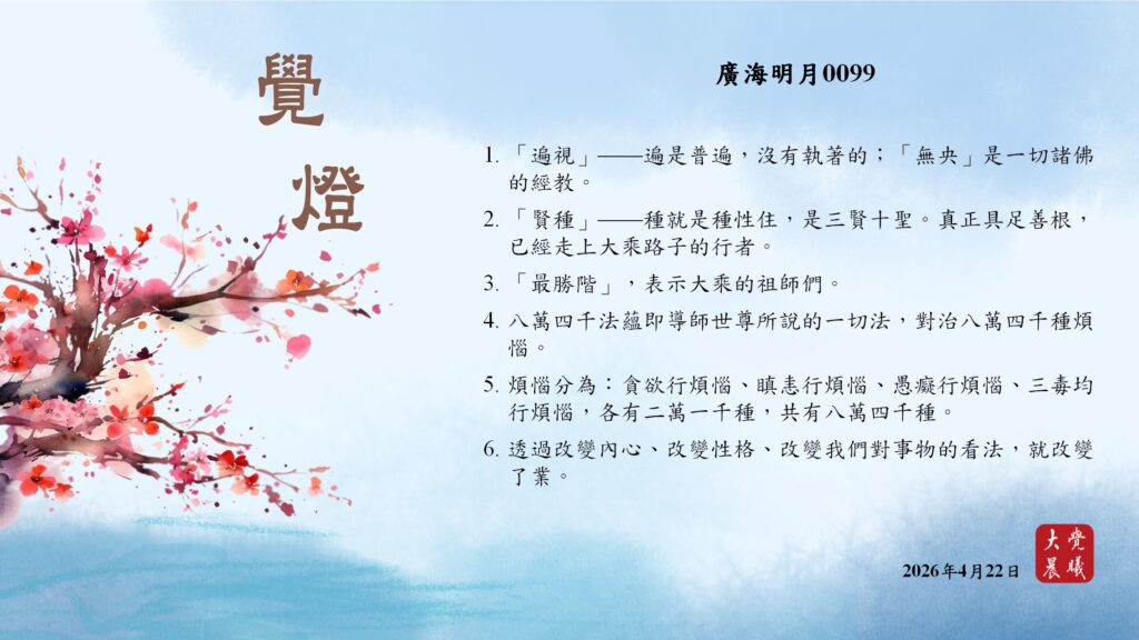 廣海明月0099 覺燈 (2026/04/22) Post author:大覺晨曦編輯組 Post published:2026/04/23 Post category:覺燈 1. 「遍視」——遍是普遍,沒有執著的;「無央」是一切諸佛的經教。2. 「賢種」——種就是種性住,是三賢十聖。真正具足善根,已經走上大乘路子的行者。3. 「最勝階」,表示大乘的祖師們。4. 八萬四千法蘊即導師世尊所說的一切法,對治八萬四千種煩惱。5. 煩惱分為:貪欲行煩惱、瞋恚行煩惱、愚癡行煩惱、三毒均行煩惱,各有二萬一千種,共有八萬四千種。6. 透過改變內心、改變性格、改變我們對事物的看法,就改變了業。 累計閱覽數: 13 Read more articles Previous Post廣海明月0098 覺燈 (2026/04/21)