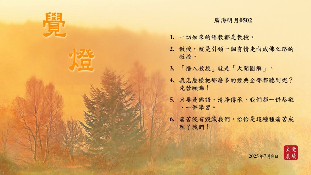 廣海明月0502 覺燈 (2025/07/08) Post author:大覺晨曦編輯組 Post published:2025/07/09 Post category:覺燈 1. 一切如來的語教都是教授。2. 教授,就是引領一個有情走向成佛之路的教授。3. 「悟入教授」就是「大開圓解」。4. 我怎麼樣把那麼多的經典全部都聽到呢?先發願嘛!5. 只要是佛語、清淨傳承,我們都一併恭敬、一併學習。6. 痛苦沒有毀滅我們,恰恰是這種種痛苦成就了我們! 累計閱覽數: 402 Read more articles Previous Post廣海明月0501 覺燈 (2025/07/07) Next Post廣海明月0503 覺燈 (2025/07/09)