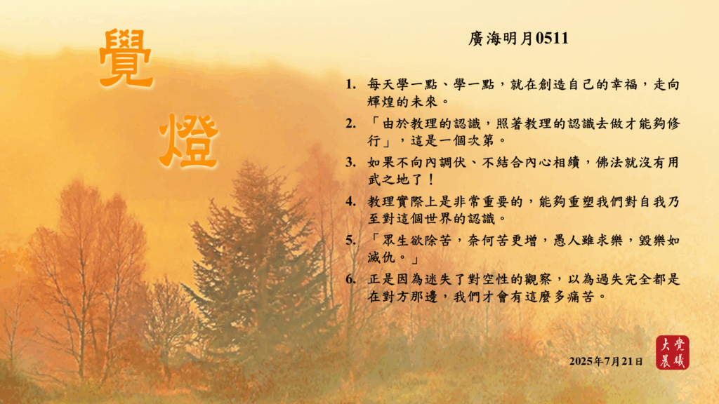 廣海明月0511 覺燈 (2025/07/21) Post author:大覺晨曦編輯組 Post published:2025/07/23 Post category:覺燈 1. 每天學一點、學一點,就在創造自己的幸福,走向輝煌的未來。2. 「由於教理的認識,照著教理的認識去做才能夠修行」,這是一個次第。3. 如果不向內調伏、不結合內心相續,佛法就沒有用武之地了!4. 教理實際上是非常重要的,能夠重塑我們對自我乃至對這個世界的認識。5. 「眾生欲除苦,奈何苦更增,愚人雖求樂,毀樂如滅仇。」6. 正是因為迷失了對空性的觀察,以為過失完全都是在對方那邊,我們才會有這麼多痛苦。 累計閱覽數: 399 Read more articles Previous Post〈居士提升營開示_聞法勝利(二)〉04 覺燈 (2025/07/20) Next Post廣海明月0512 覺燈 (2025/07/22)