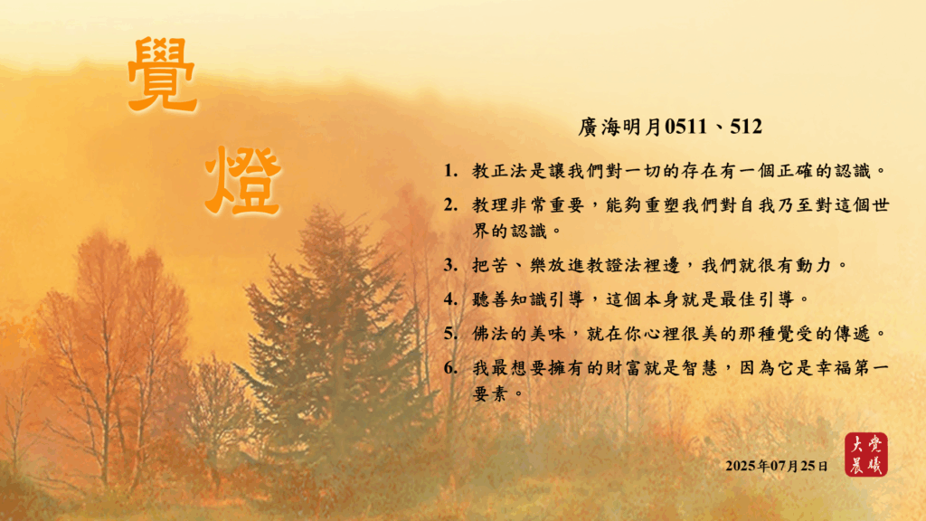 廣海明月0511、0512 覺燈 (2025/07/25) Post author:大覺晨曦編輯組 Post published:2025/07/26 Post category:覺燈 1. 教正法是讓我們對一切的存在有一個正確的認識。2. 教理非常重要,能夠重塑我們對自我乃至對這個世界的認識。3. 把苦、樂放進教證法裡邊,我們就很有動力。4. 聽善知識引導,這個本身就是最佳引導。5. 佛法的美味,就在你心裡很美的那種覺受的傳遞。6. 我最想要擁有的財富就是智慧,因為它是幸福第一要素。 累計閱覽數: 454 Read more articles Previous Post廣海明月0514 覺燈 (2025/07/24) Next Post廣海明月0513、0514 覺燈 (2025/07/26)