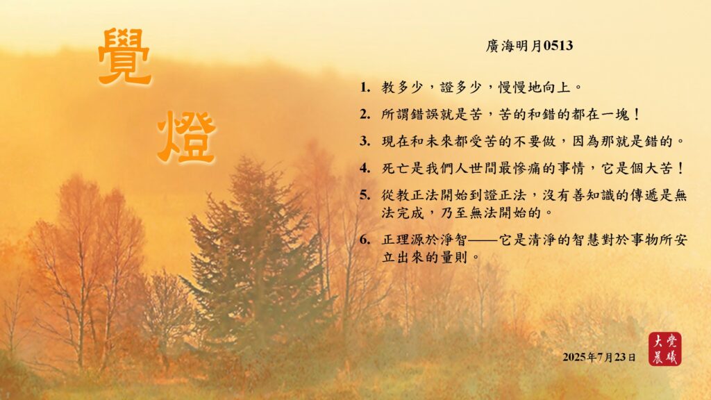 廣海明月0513 覺燈 (2025/07/23) Post author:大覺晨曦編輯組 Post published:2025/07/24 Post category:覺燈 1. 教多少,證多少,慢慢地向上。2. 所謂錯誤就是苦,苦的和錯的都在一塊!3. 現在和未來都受苦的不要做,因為那就是錯的。4. 死亡是我們人世間最慘痛的事情,它是個大苦!5. 從教正法開始到證正法,沒有善知識的傳遞是無法完成,乃至無法開始的。6. 正理源於淨智——它是清淨的智慧對於事物所安立出來的量則。 累計閱覽數: 411 Read more articles Previous Post廣海明月0512 覺燈 (2025/07/22) Next Post廣海明月0514 覺燈 (2025/07/24)