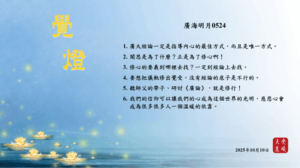 廣海明月0524 覺燈2 (2025/10/10) Post author:大覺晨曦編輯組 Post published:2025/10/11 Post category:覺燈 1. 廣大經論一定是指導內心的最佳方式,而且是唯一方式。2. 聞思是為了什麼?正是為了修心啊!3. 修心的要義到哪裡去找?一定到經論上去找。4. 要想把儀軌修出覺受,沒有經論的底子是不行的。5. 聽師父的帶子、研討《廣論》,就是修行!6. 我們的信仰可以讓我們的心成為這個世界的光明,慈悲心會成為很多很多人一個溫暖的依靠。。 累計閱覽數: 459 Read more articles Previous Post廣海明月0524 覺燈1 (2025/10/09) Next Post廣海明月0524 覺燈3 (2025/10/11)