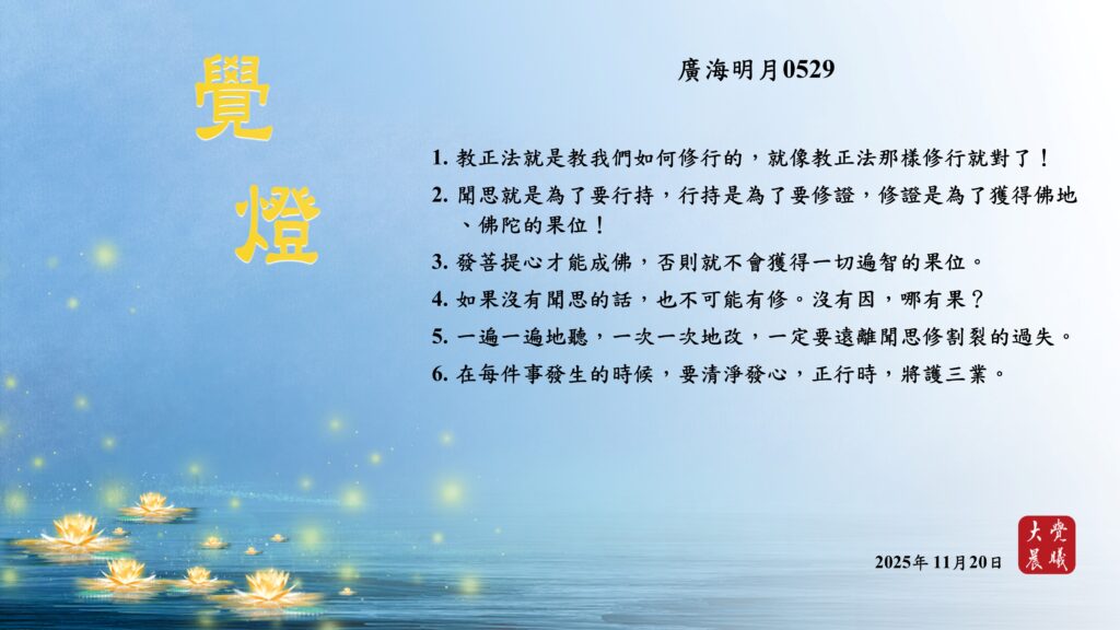 廣海明月0529 覺燈1 (2025/11/20) Post author:大覺晨曦編輯組 Post published:2025/11/21 Post category:覺燈 1. 教正法就是教我們如何修行的,就像教正法那樣修行就對了!2. 聞思就是為了要行持,行持是為了要修證,修證是為了獲得佛地、佛陀的果位!3. 發菩提心才能成佛,否則就不會獲得一切遍智的果位。4. 如果沒有聞思的話,也不可能有修。沒有因,哪有果?5. 一遍一遍地聽,一次一次地改,一定要遠離聞思修割裂的過失。6. 在每件事發生的時候,要清淨發心,正行時,將護三業。 累計閱覽數: 535 Read more articles Previous Post廣海明月0033 覺燈 (2025/11/19) Next Post廣海明月0529 覺燈2 (2025/11/21)