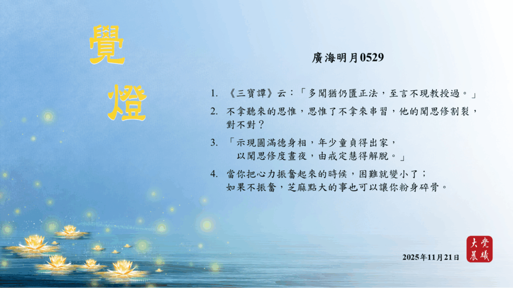 廣海明月0529 覺燈2 (2025/11/21) Post author:大覺晨曦編輯組 Post published:2025/11/22 Post category:覺燈 1. 《三寶譚》云:「多聞猶仍匱正法,至言不現教授過。」2. 不拿聽來的思惟,思惟了不拿來串習,他的聞思修割裂,對不對?3. 「示現圓滿德身相,年少童貞得出家,以聞思修度晝夜,由戒定慧得解脫。」4. 當你把心力振奮起來的時候,困難就變小了;如果不振奮,芝麻點大的事也可以讓你粉身碎骨。 累計閱覽數: 445 Read more articles Previous Post廣海明月0529 覺燈1 (2025/11/20) Next Post廣海明月0529 覺燈3 (2025/11/22)