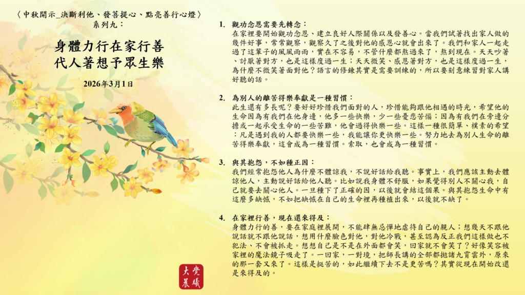 身體力行的善,要在家庭裡展開,不能肆無忌憚地虐待自己的親人;想幾天不跟他說話就不跟他說話,想用什麼臉色對他,對他冷戰,甚至認為反正我們這樣做也不犯法、不會被抓走。想想自己是不是在外面都會笑,回家就不會笑了?好像笑容被家裡的魔法鏡子吸走了。一回家,一對境,把師長講的全部都拋諸九霄雲外,原來的那一套又來了。這樣是挺苦的,如此繼續下去不是更苦嗎?其實從現在開始改還是來得及的。