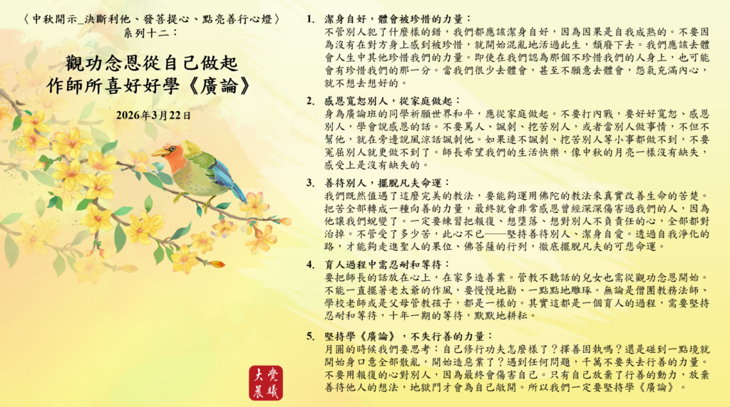 〈中秋開示_決斷利他、發菩提心、點亮善行心燈〉12:觀功念恩從自己做起,作師所喜好好學《廣論》(2026/03/22)