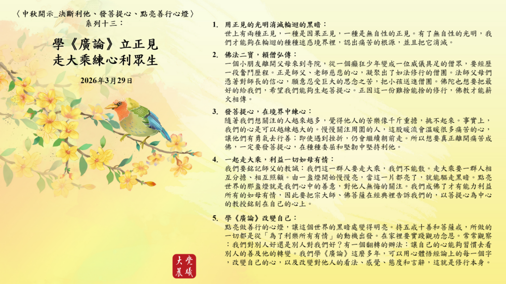點亮做善行的心燈,讓這個世界的黑暗處變得明亮。持五戒十善和菩薩戒,所做的一切都是從「為了利樂所有有情」的動機出發。在家裡要實踐觀功念恩。常常觀察:我們對別人好還是別人對我們好?有一個翻轉的辦法:讓自己的心能夠習慣去看別人的善及他的轉變。我們學《廣論》這麼多年,可以用心體悟經論上的每一個字,改變自己的心,以及改變對他人的看法、感覺、態度和言辭,這就是修行本身。