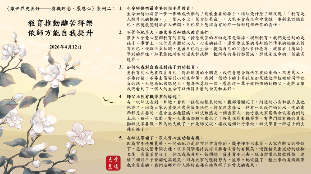 有一次師父走到一片地,看到一條很粗很長的蛇,腹部潰爛死了,附近的小鳥和很多魚也死掉了,因為大家大量使用農藥殺死牠們。師父非常傷心,終有一天我們喝的水,吃的東西都是有毒的,還會生各種怪病。師父雖然是一個出家人,他呼籲大家農藥會坑害我們的土地、孩子、家園,有一天東西都種不出來了!於是推展有機事業。有專門做有機的專家勸師父不要做,因為他失敗了,但是師父說,讓我這個外行來做。師父帶著一群居士們去種有機了。