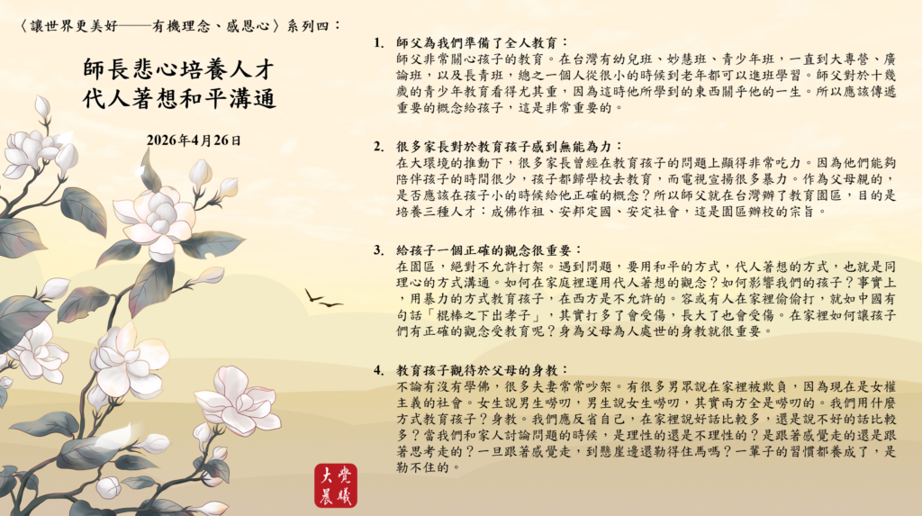 在大環境的推動下,很多家長曾經在教育孩子的問題上顯得非常吃力。因為他們能夠陪伴孩子的時間很少,孩子都歸學校去教育,而電視宣揚很多暴力。作為父母親的,是否應該在孩子小的時候給他正確的概念?所以師父就在台灣辦了教育園區,目的是培養三種人才:成佛作祖、安邦定國、安定社會,這是園區辦校的宗旨。