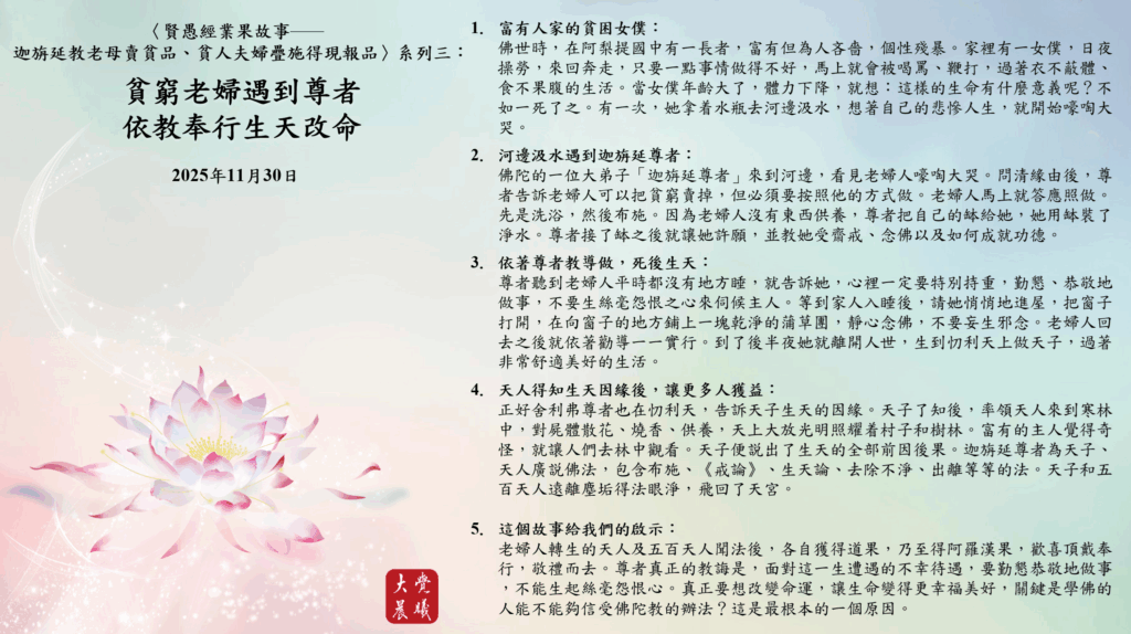 〈賢愚經業果故事──迦旃延教老母賣貧品、貧人夫婦疊施得現報品〉03:貧窮老婦遇到尊者,依教奉行生天改命 (2025/11/30)