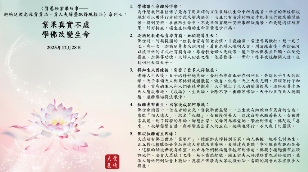 2. 迦旃延教老母賣掉貧窮,她依勸導生天: