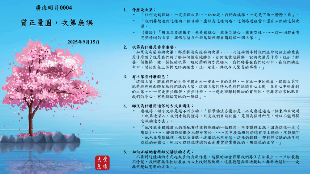 「這個次第,將在我們的生命中揭示出一重比一重的美好、一重比一重的欣喜。這個次第可能是經典裡面師父給我們講的次第,這個次第同時也是我們認識自心之後,在自心中所看到的次第⋯⋯一定是步步離苦、步步得樂,⋯⋯還是回歸到佛法的實用性,它非常非常地貼緊我們的身心,它是腳踏實地的一條路」。