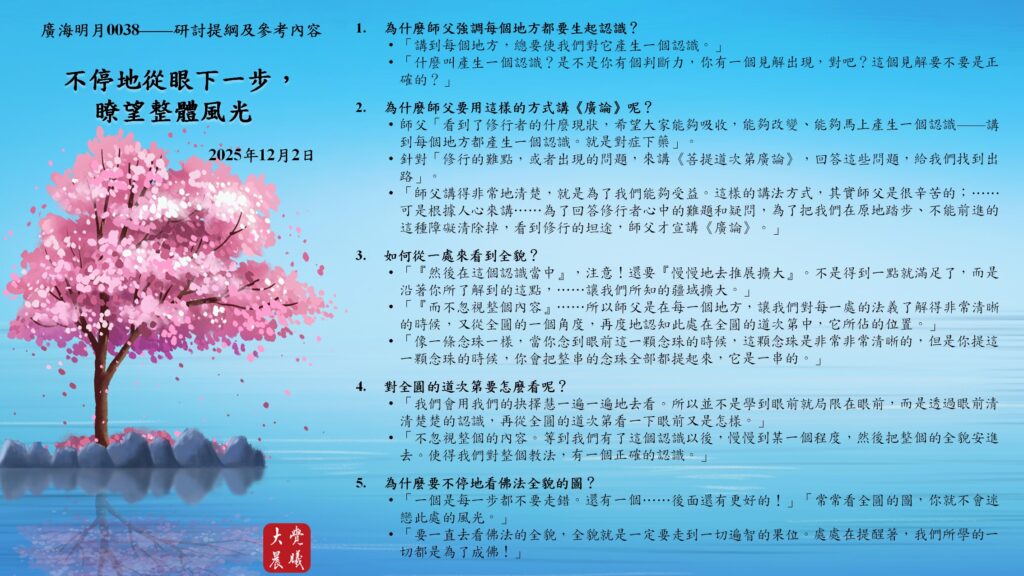 ﹡「不忽視整個的內容。等到我們有了這個認識以後,慢慢到某一個程度,然後把整個的全貌安進去。使得我們對整個教法,有一個正確的認識。」