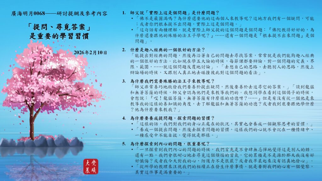﹡「這句話有兩種理解,就是實際上師父提的這個問題是個問題:『佛陀教得好好的,為什麼還要跟他的殊勝的法王子學呢?』⋯⋯還有一個問題是『根本提不出來問題』是個問題」。