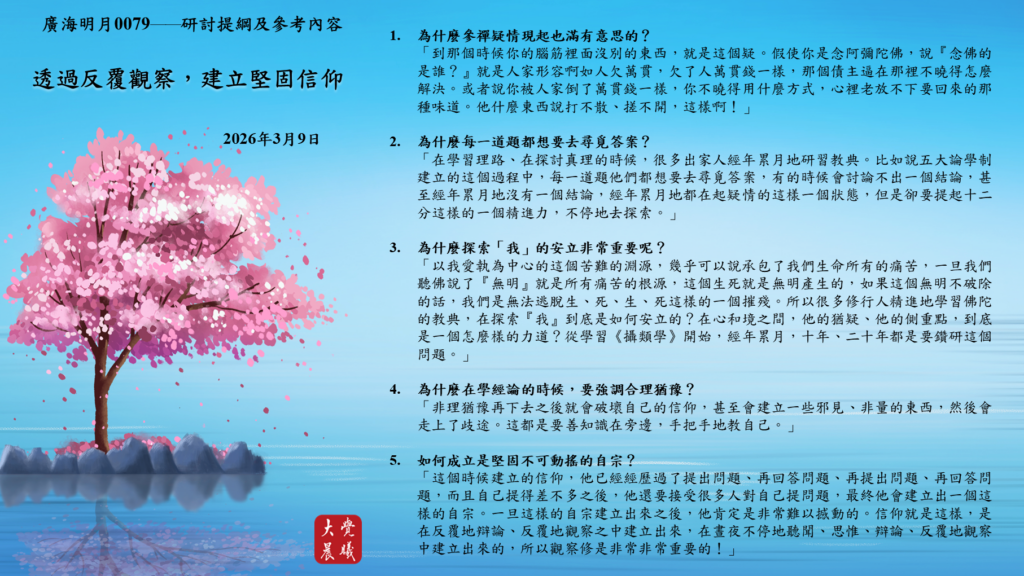 「這個時候建立的信仰,他已經經歷過了提出問題、再回答問題、再提出問題、再回答問題,而且自己提得差不多之後,他還要接受很多人對自己提問題,最終他會建立出一個這樣的自宗。一旦這樣的自宗建立出來之後,他肯定是非常難以撼動的。信仰就是這樣,是在反覆地辯論、反覆地觀察之中建立出來,在晝夜不停地聽聞、思惟、辯論、反覆地觀察中建立出來的,所以觀察修是非常非常重要的!」