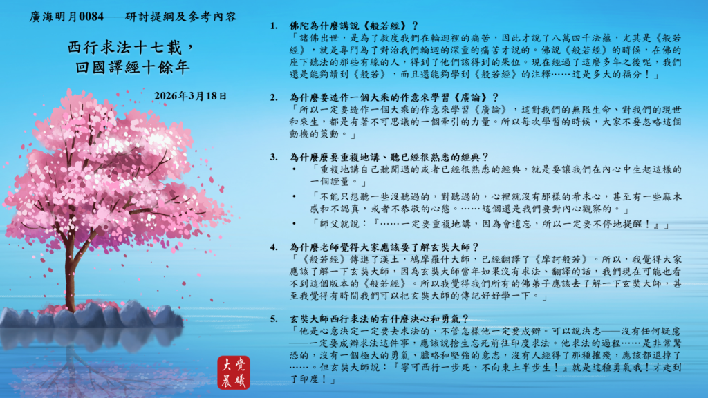「所以一定要造作一個大乘的作意來學習《廣論》,這對我們的無限生命、對我們的現世和來生,都是有著不可思議的一個牽引的力量。所以每次學習的時候,大家不要忽略這個動機的策動。」