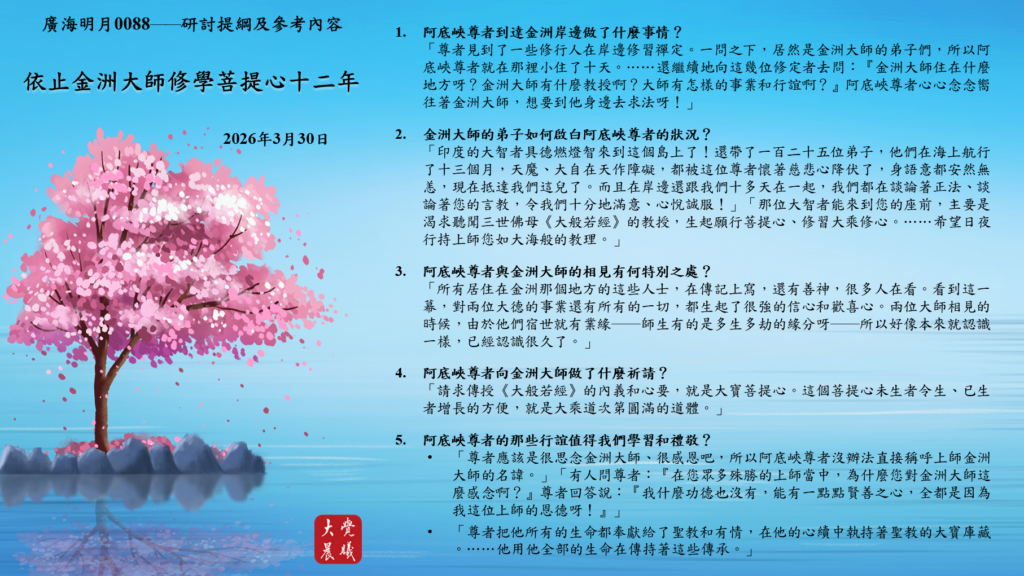 廣海明月0088 依止金洲大師修學菩提心十二年—研討題綱及參考內容 (2026/03/30)
