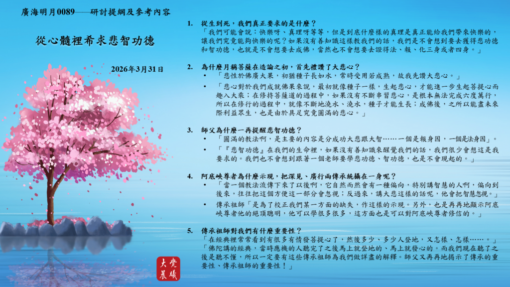 ﹡「『 悲智功德 』在我們的生命裡,如果沒有善知識來醒覺我們的話,我們很少會想這是我要求的。我們也不會想到跟著一個老師要學悲功德、智功德,也是不會現起的。」
