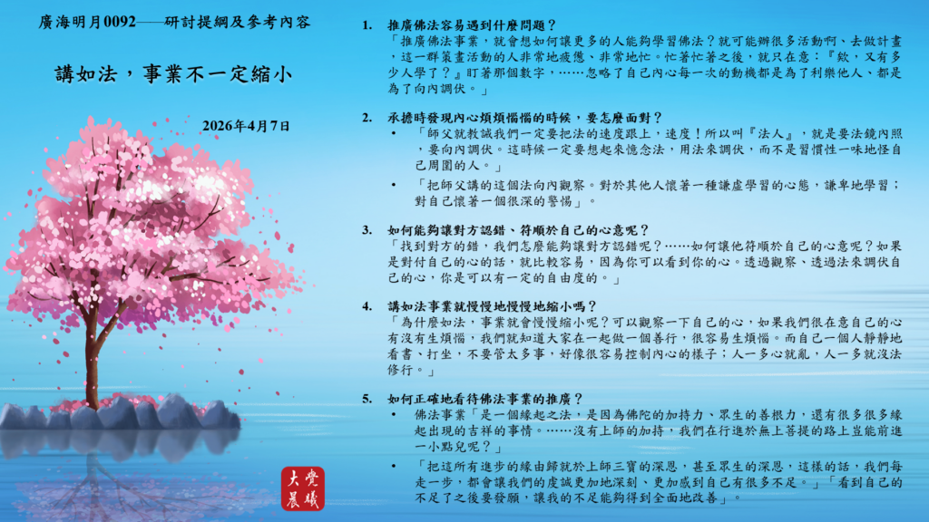 「推廣佛法事業,就會想如何讓更多的人能夠學習佛法?就可能辦很多活動啊、去做計畫,這一群策畫活動的人非常地疲憊、非常地忙。忙著忙著之後,就只在意:『欸,又有多少人學了?』盯著那個數字,⋯⋯忽略了自己內心每一次的動機都是為了利樂他人、都是為了向內調伏。」