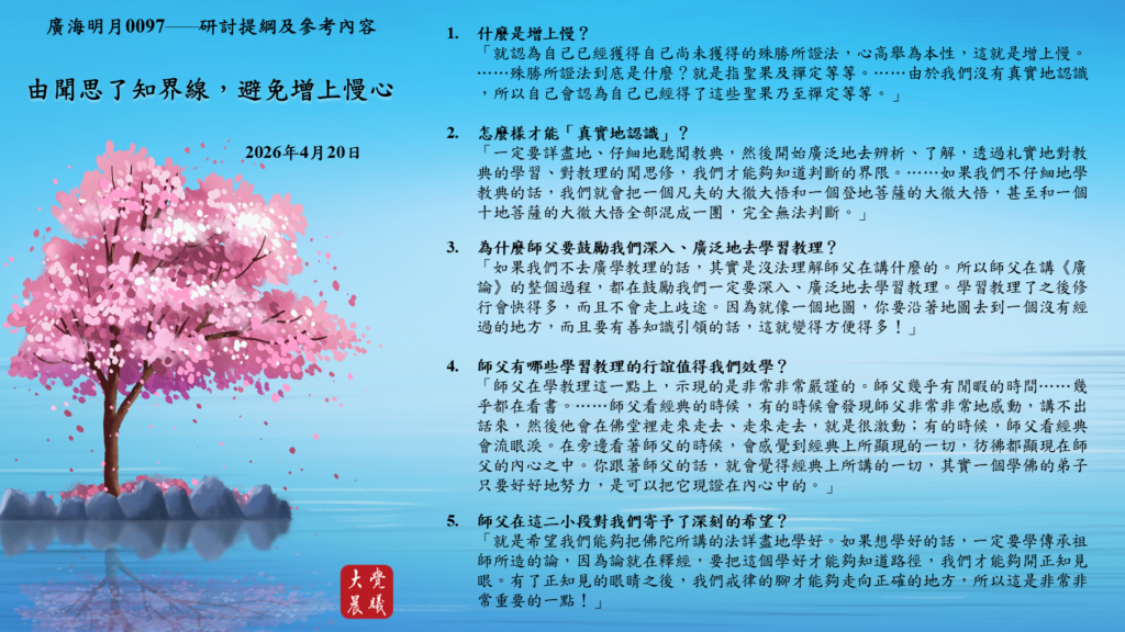 「如果我們不去廣學教理的話,其實是沒法理解師父在講什麼的。所以師父在講《廣論》的整個過程,都在鼓勵我們一定要深入、廣泛地去學習教理。學習教理了之後修行會快得多,而且不會走上歧途。因為就像一個地圖,你要沿著地圖去到一個沒有經過的地方,而且要有善知識引領的話,這就變得方便得多!」