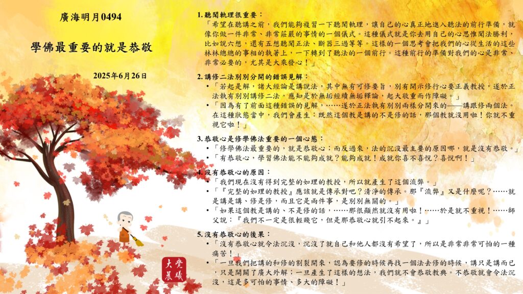 *「修學佛法最重要的,就是恭敬心;而反過來,法的沉沒最主要的原因哪,就是沒有恭敬。」