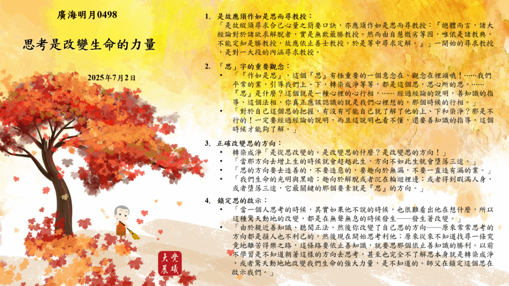 ﹡「由於親近善知識、聽聞正法,然後你改變了自己思的方向——原來常常思考的方向都是損人也不利己的,然後現在開始思考利他;原來從來不知道找尋一條究竟地離苦得樂之路,這條路要依止善知識,就要思那個依止善知識的勝利。以前不學習是不知道朝著這樣的方向去思考,甚至也完全不了解思本身就是轉染成淨,或者驚天動地地改變我們生命的強大力量,是不知道的。師父在鎖定這個思在啟示我們。」