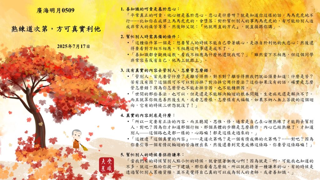 ﹡「所以一定要有正法的內容,而且聽聞、思惟、修,通常是自己在心裡熟練了才能夠去幫別人,對吧?因為你才知道那個行相、那個具體的步驟是怎麼操作,內心已經熟練了,才知道別人──這個路也是都一樣的,心路嘛!都是這樣走過來的。」