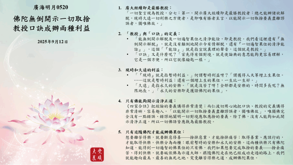 *「能無倒開示解脫及一切遍智果位之清淨能詮,即是教授。我們看這裡邊有『無倒開示解脫』,就是沒有顛倒地開示令有情解脫,還有『一切遍智果位的清淨能詮』」,這個「『能詮』」就是指宣說真理的聲音,這個就是教授。」