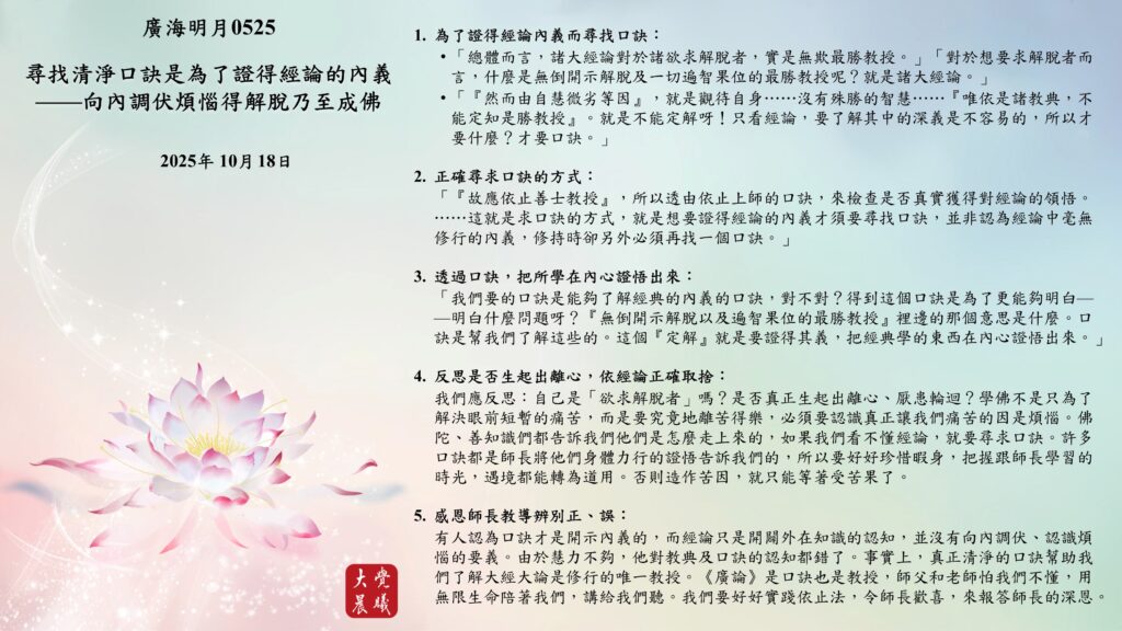 廣海明月0525 學習重點3—尋找清淨口訣是為了證得經論的內義──向內調伏煩惱得解脫乃至成佛 (2025/10/18)
