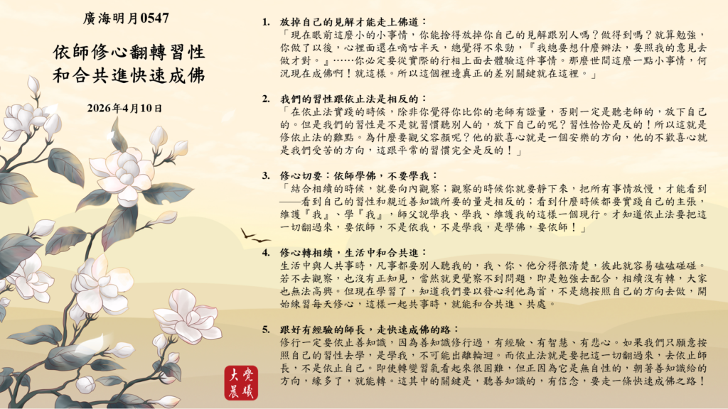 「結合相續的時候,就要向內觀察;觀察的時候你就要靜下來,把所有事情放慢,才能看到——看到自己的習性和親近善知識所要的量是相反的;看到什麼時候都要實踐自己的主張,維護『我』、學『我』,師父說學我、學我、維護我的這樣一個現行。才知道依止法要把這一切翻過來,要依師,不是依我,不是學我,是學佛,要依師!」