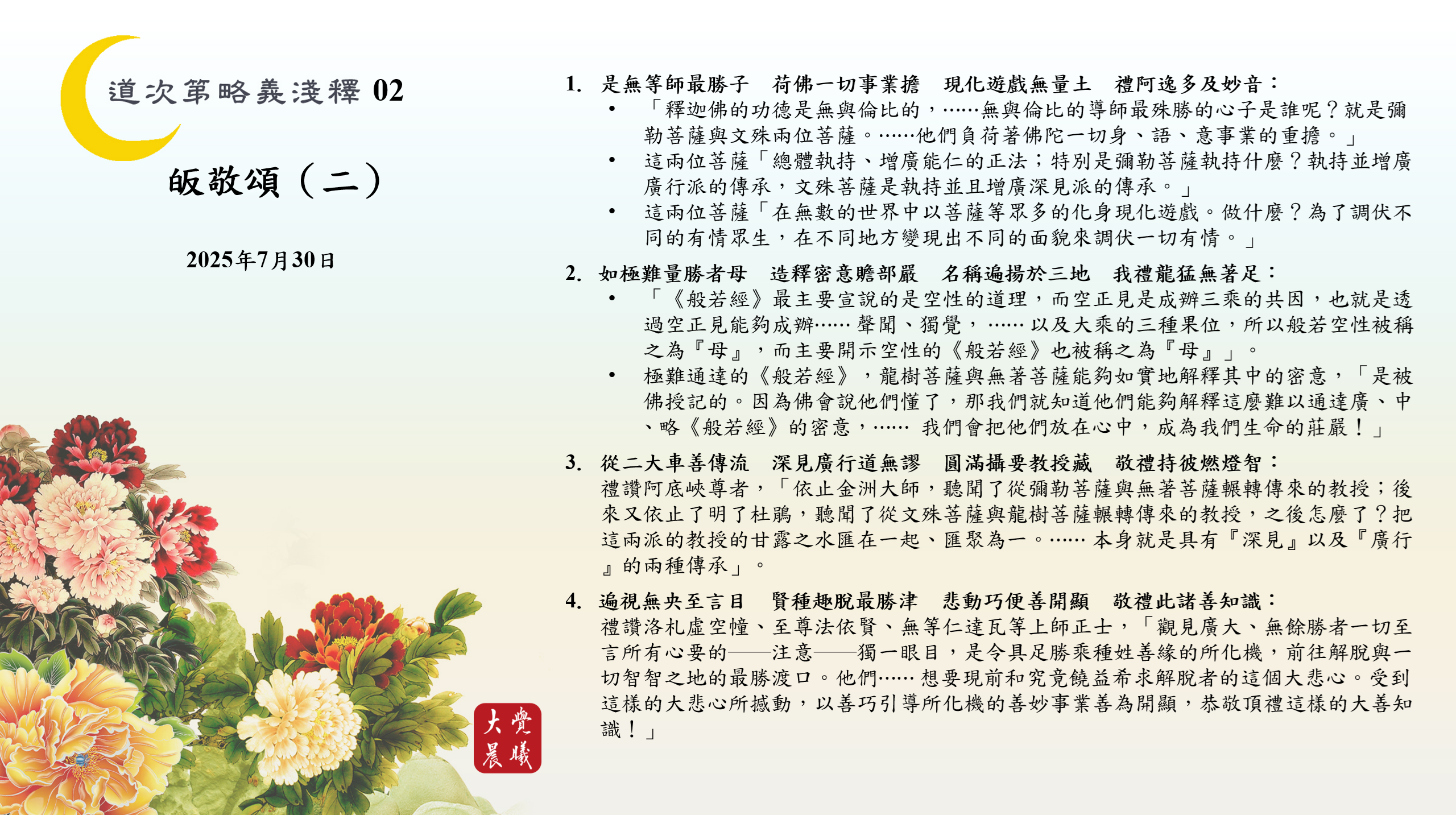 *「釋迦佛的功德是無與倫比的,⋯⋯無與倫比的導師最殊勝的心子是誰呢?就是彌勒菩薩與文殊兩位菩薩。⋯⋯他們負荷著佛陀一切身、語、意事業的重擔。」