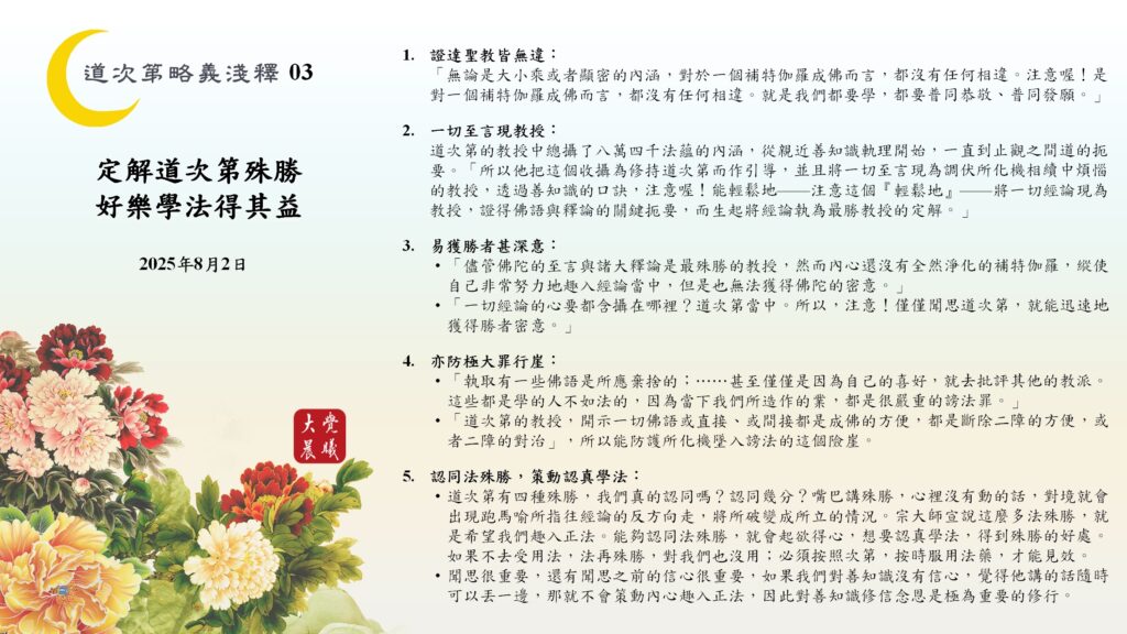 道次第的教授中總攝了八萬四千法蘊的內涵,從親近善知識軌理開始,一直到止觀之間道的扼要。「所以他把這個收攝為修持道次第而作引導,並且將一切至言現為調伏所化機相續中煩惱的教授,透過善知識的口訣,注意喔!能輕鬆地——注意這個『輕鬆地』——將一切經論現為教授,證得佛語與釋論的關鍵扼要,而生起將經論執為最勝教授的定解。」