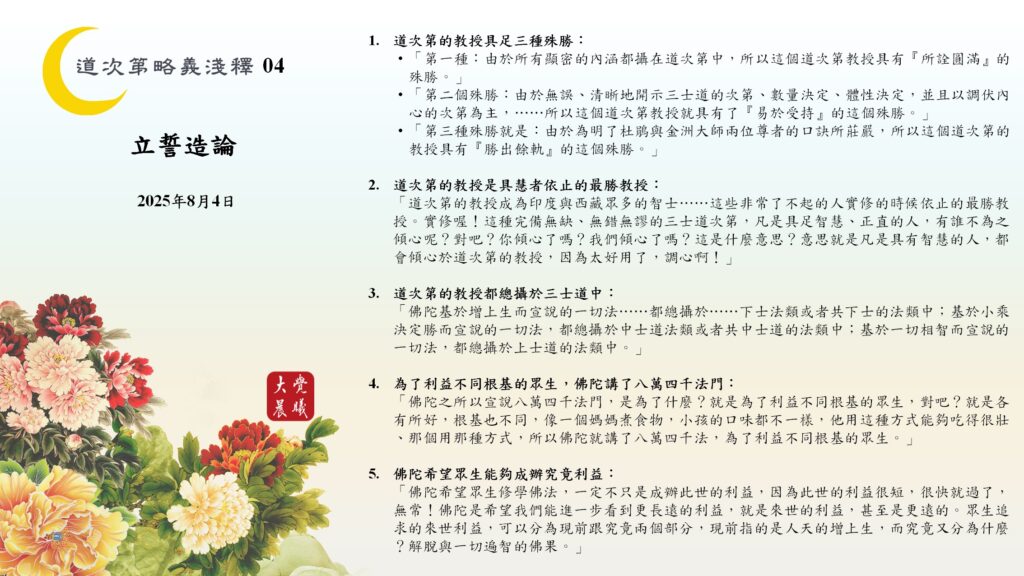 「道次第的教授成為印度與西藏眾多的智士⋯⋯這些非常了不起的人實修的時候依止的最勝教授。實修喔!這種完備無缺、無錯無謬的三士道次第,凡是具足智慧、正直的人,有誰不為之傾心呢?對吧?你傾心了嗎?我們傾心了嗎?這是什麼意思?意思就是凡是具有智慧的人,都會傾心於道次第的教授,因為太好用了,調心啊!」
