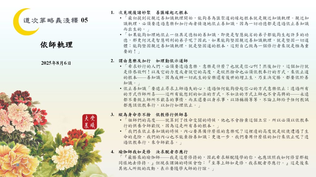 ﹡依止善知識「要遮止尋求上師過失的心,透過任何能夠發起信心的方式意樂依止;透過所有的方式作師所喜——這所有能想到的如法的方式,不如法的方式上師也不會高興的——永遠都不要做上師所不歡喜的事情,而且還要以身承事、以語稱揚等等,不論上師給予任何教誡都應該依教奉行,以加行如理依止。」