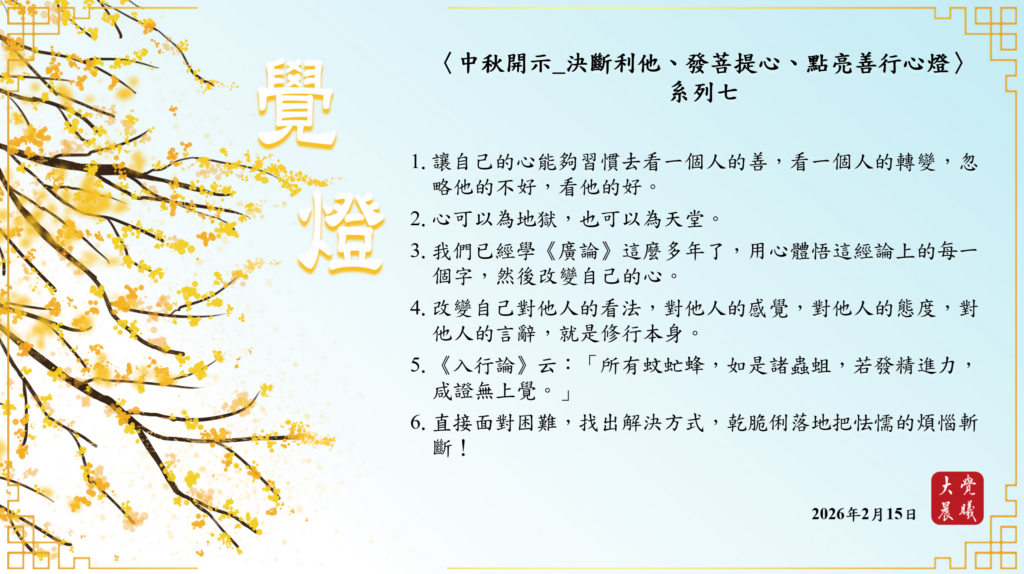 〈中秋開示_決斷利他、發菩提心、點亮善行心燈〉07 覺燈 (2026/02/15) Post author:大覺晨曦編輯組 Post published:2026/02/17 Post category:覺燈 1. 讓自己的心能夠習慣去看一個人的善,看一個人的轉變,忽略他的不好,看他的好。2. 心可以為地獄,也可以為天堂。3. 我們已經學《廣論》這麼多年了,用心體悟這經論上的每一個字,然後改變自己的心。4. 改變自己對他人的看法,對他人的感覺,對他人的態度,對他人的言辭,就是修行本身。5. 《入行論》云:「所有蚊虻蜂,如是諸蟲蛆,若發精進力,咸證無上覺。」6. 直接面對困難,找出解決方式,乾脆俐落地把怯懦的煩惱斬斷! 累計閱覽數: 144 Read more articles Previous Post廣海明月0540 覺燈3 (2026/02/14) Next Post廣海明月0070 覺燈 (2026/02/16)