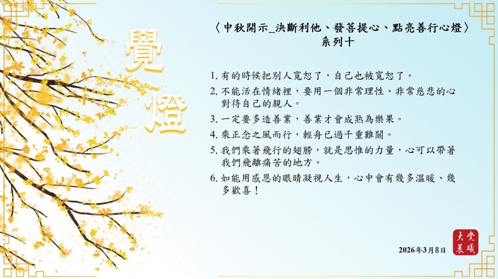 〈中秋開示_決斷利他、發菩提心、點亮善行心燈〉10 覺燈 (2026/03/08) Post author:大覺晨曦編輯組 Post published:2026/03/10 Post category:覺燈 1. 有的時候把別人寬恕了,自己也被寬恕了。2. 不能活在情緒裡,要用一個非常理性、非常慈悲的心對待自己的親人。3. 一定要多造善業,善業才會成熟為樂果。4. 乘正念之風而行,輕舟已過千重難關。5. 我們乘著飛行的翅膀,就是思惟的力量,心可以帶著我們飛離痛苦的地方。6. 如能用感恩的眼睛凝視人生,心中會有幾多溫暖、幾多歡喜! 累計閱覽數: 178 Read more articles Previous Post廣海明月0542 覺燈3 (2026/03/07) Next Post廣海明月0079 覺燈 (2026/03/09)