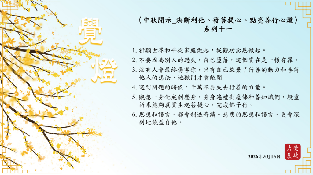 〈中秋開示_決斷利他、發菩提心、點亮善行心燈〉11 覺燈 (2026/03/15) Post author:大覺晨曦編輯組 Post published:2026/03/17 Post category:覺燈 1. 祈願世界和平從家庭做起,從觀功念恩做起。2. 不要因為別人的過失,自己墮落,這個實在是一樣有罪。3. 沒有人會最終傷害你,只有自己放棄了行善的動力和善待他人的想法,地獄門才會敞開。4. 遇到問題的時候,千萬不要失去行善的力量。5. 觀想一身化成剎塵身,身身遍禮剎塵佛和善知識們,殷重祈求能夠真實生起菩提心,完成佛子行。6. 思想和語言,都會創造奇蹟。慈悲的思想和語言,更會深刻地饒益自他。 累計閱覽數: 186 Read more articles Previous Post廣海明月0543 覺燈3 (2026/03/14) Next Post廣海明月0082 覺燈 (2026/03/16)