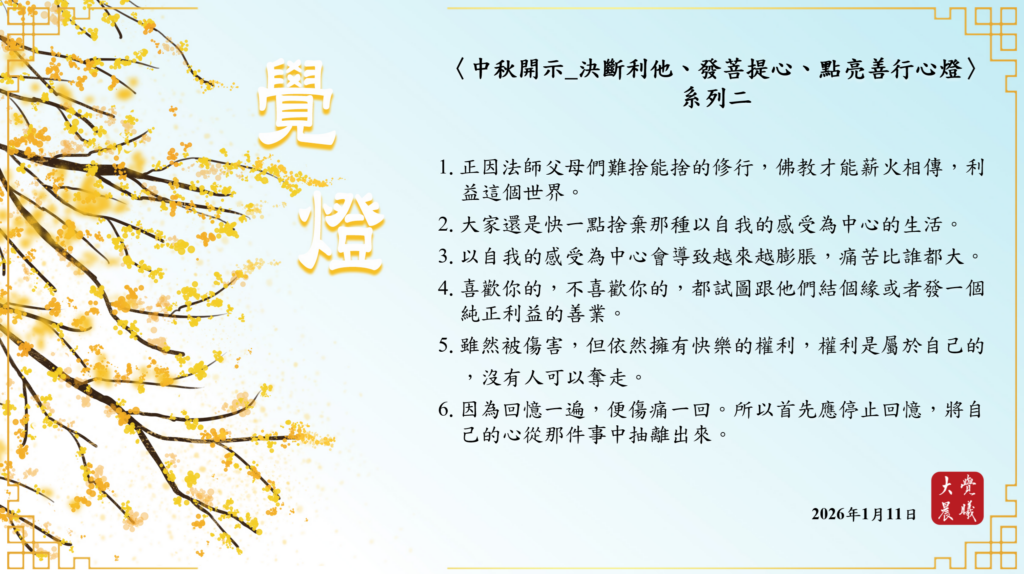 〈中秋開示_決斷利他、發菩提心、點亮善行心燈〉02 覺燈 (2026/01/11) Post author:大覺晨曦編輯組 Post published:2026/01/14 Post category:覺燈 1. 正因法師父母們難捨能捨的修行,佛教才能薪火相傳,利益這個世界。2. 大家還是快一點捨棄那種以自我的感受為中心的生活。3. 以自我的感受為中心會導致越來越膨脹,痛苦比誰都大。4. 喜歡你的,不喜歡你的,都試圖跟他們結個緣或者發一個純正利益的善業。5. 雖然被傷害,但依然擁有快樂的權利,權利是屬於自己的,沒有人可以奪走。6. 因為回憶一遍,便傷痛一回。所以首先應停止回憶,將自己的心從那件事中抽離出來。 累計閱覽數: 158 Read more articles Previous Post廣海明月0535 覺燈3 (2026/01/10) Next Post廣海明月0055 覺燈 (2026/01/12)