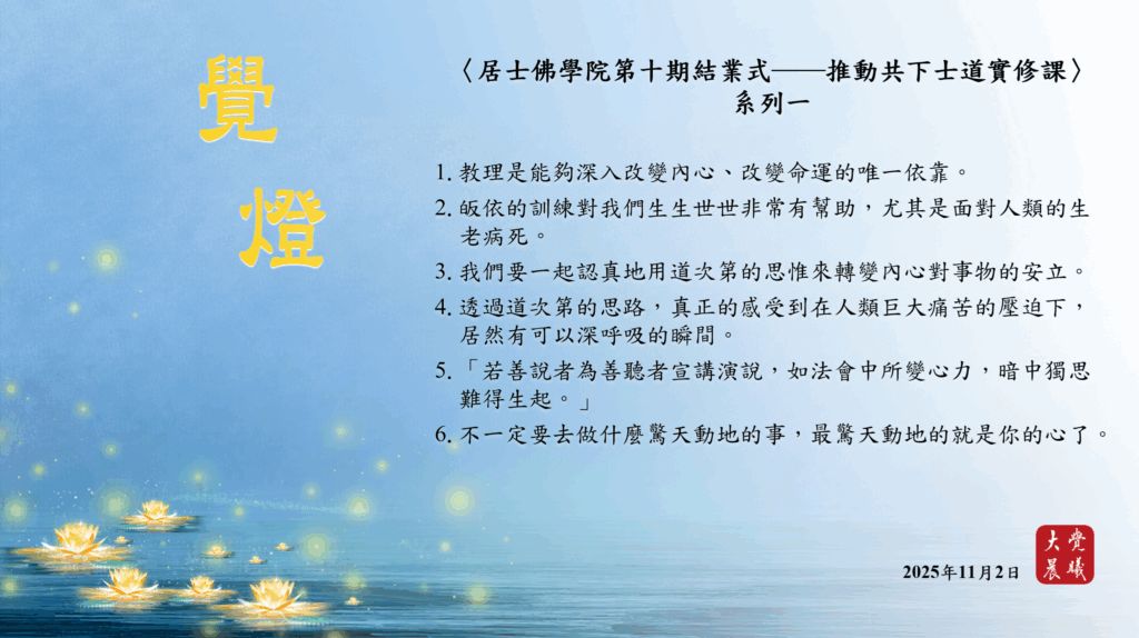 〈居士佛學院第十期結業式──推動共下士道實修課〉01 覺燈 (2025/11/02) Post author:大覺晨曦編輯組 Post published:2025/11/04 Post category:覺燈 1. 教理是能夠深入改變內心、改變命運的唯一依靠。2. 皈依的訓練對我們生生世世非常有幫助,尤其是面對人類的生老病死。3. 我們要一起認真地用道次第的思惟來轉變內心對事物的安立。4. 透過道次第的思路,真正的感受到在人類巨大痛苦的壓迫下,居然有可以深呼吸的瞬間。5. 「若善說者為善聽者宣講演說,如法會中所變心力,暗中獨思難得生起。」6. 不一定要去做什麼驚天動地的事,最驚天動地的就是你的心了。 累計閱覽數: 357 Read more articles Previous Post廣海明月0527 覺燈3 (2025/11/01) Next Post廣海明月0025 覺燈 (2025/11/03)