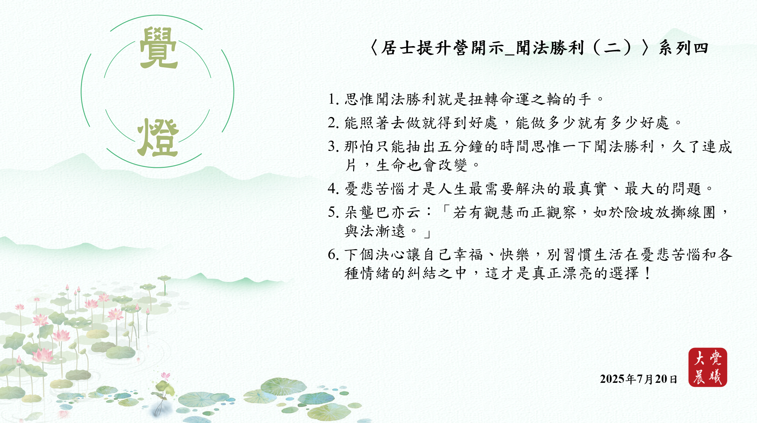 〈居士提升營開示_聞法勝利(二)〉04 覺燈 (2025/07/20) Post author:大覺晨曦編輯組 Post published:2025/07/21 Post category:覺燈 1. 思惟聞法勝利就是扭轉命運之輪的手。2. 能照著去做就得到好處,能做多少就有多少好處。3. 那怕只能抽出五分鐘的時間思惟一下聞法勝利,久了連成片,生命也會改變。4. 憂悲苦惱才是人生最需要解決的最真實、最大的問題。5. 朵壟巴亦云:「若有觀慧而正觀察,如於險坡放擲線團,與法漸遠。」6. 下個決心讓自己幸福、快樂,別習慣生活在憂悲苦惱和各種情緒的糾結之中,這才是真正漂亮的選擇! 累計閱覽數: 454 Read more articles Previous Post廣海明月0506-0510 覺燈 (2025/07/19) Next Post廣海明月0511 覺燈 (2025/07/21)