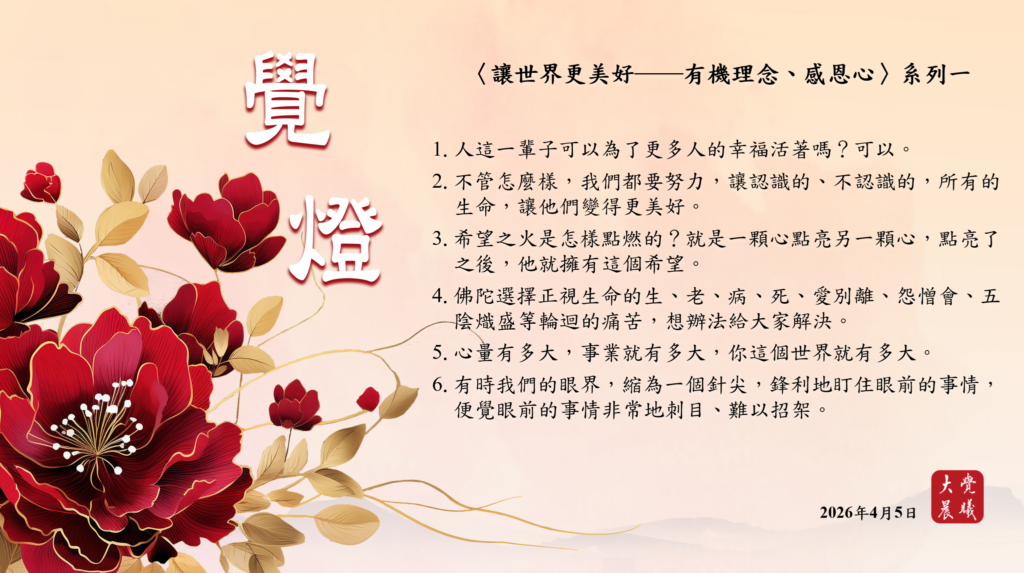 〈讓世界更美好──有機理念、感恩心〉1 覺燈 (2026/04/05) Post author:大覺晨曦編輯組 Post published:2026/04/07 Post category:覺燈 1. 人這一輩子可以為了更多人的幸福活著嗎?可以。2. 不管怎麼樣,我們都要努力,讓認識的、不認識的,所有生命變得更美好。3. 希望之火是怎樣點燃的?就是一顆心點亮另一顆心,點亮了之後,他就擁有希望。4. 佛陀選擇正視生命的生、老、病、死、愛別離、怨憎會、五陰熾盛等輪迴的痛苦,想辦法為大家解決。5. 心量有多大,事業就有多大,你這個世界就有多大。6. 有時我們的眼界,縮為一個針尖,鋒利地盯住眼前的事情,便覺眼前的事情非常地刺目、難以招架。 累計閱覽數: 131 Read more articles Previous Post廣海明月0546 覺燈3 (2026/04/04) Next Post廣海明月0091 覺燈 (2026/04/06)