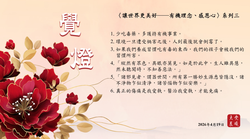 〈讓世界更美好──有機理念、感恩心〉3 覺燈 (2026/04/19) Post author:大覺晨曦編輯組 Post published:2026/04/21 Post category:覺燈 1. 少吃毒藥,多護持有機事業。2. 環境一旦遭受禍害之後,人到最後就會倒霉了。3. 如果我們養成習慣吃有毒的東西,我們的孩子會被我們的習慣所害。4. 「縱然有眾色,具眼亦莫見。如是於此中,生人雖具慧,然未聽聞時,不知善惡法。」5. 「諸邪見者,謂器世間,所有第一勝妙生源悉皆隱沒,諸不淨物乍似清淨,諸苦惱物乍似安樂。」6. 真正的傷痛是我愛執。醫治我愛執,才能免痛。 累計閱覽數: 49 Read more articles Previous Post廣海明月0548 覺燈3 (2026/04/18) Next Post廣海明月0097 覺燈 (2026/04/20)